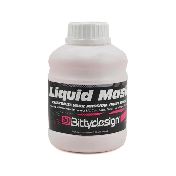 This is a sixteen ounce bottle of Bittydesign Liquid Mask. Bittydesign Liquid Mask will save you time and help you produce a better finished product. This 16 ounce bottle will cover approximately ten 1/8 buggy bodies.