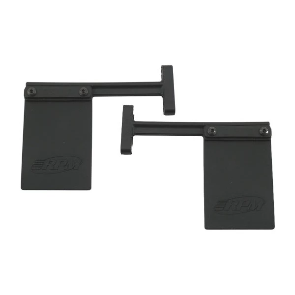 That is no longer an issue! RPM now has a mud flap system that integrates with our Rear Bumper for the Traxxas Slash 2wd (RPM #81002, #81003 & #81005) and Slash 4×4 (RPM #80122, #80123 & #80125). The RPM Mud Flap System uses a pair of molded nylon support arms that bolt to pre-existing holes in the RPM bumper supports of our Slash rear bumpers. These support arms hold a set of well-designed rubber mud flaps that incorporate the molded RPM Logo on one side and are blank on the other. One final touch is a pair of molded screw supports that help prevent the screws from pulling through the soft rubber of the mud flaps.