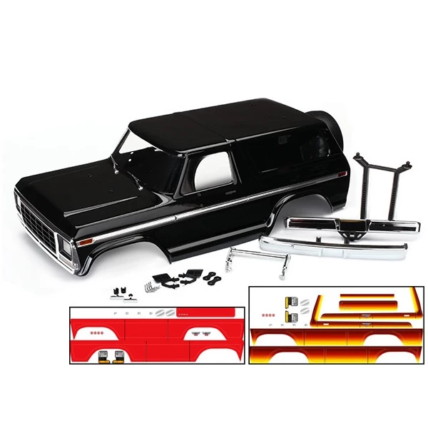 Traxxas Body, Ford Bronco, complete (black) (includes front and rear bumpers, push bar, rear body mount, grill, side mirrors, door handles, windshield wipers, spare tire mount, red and sunset decals) (requires #8072 inner fenders)
